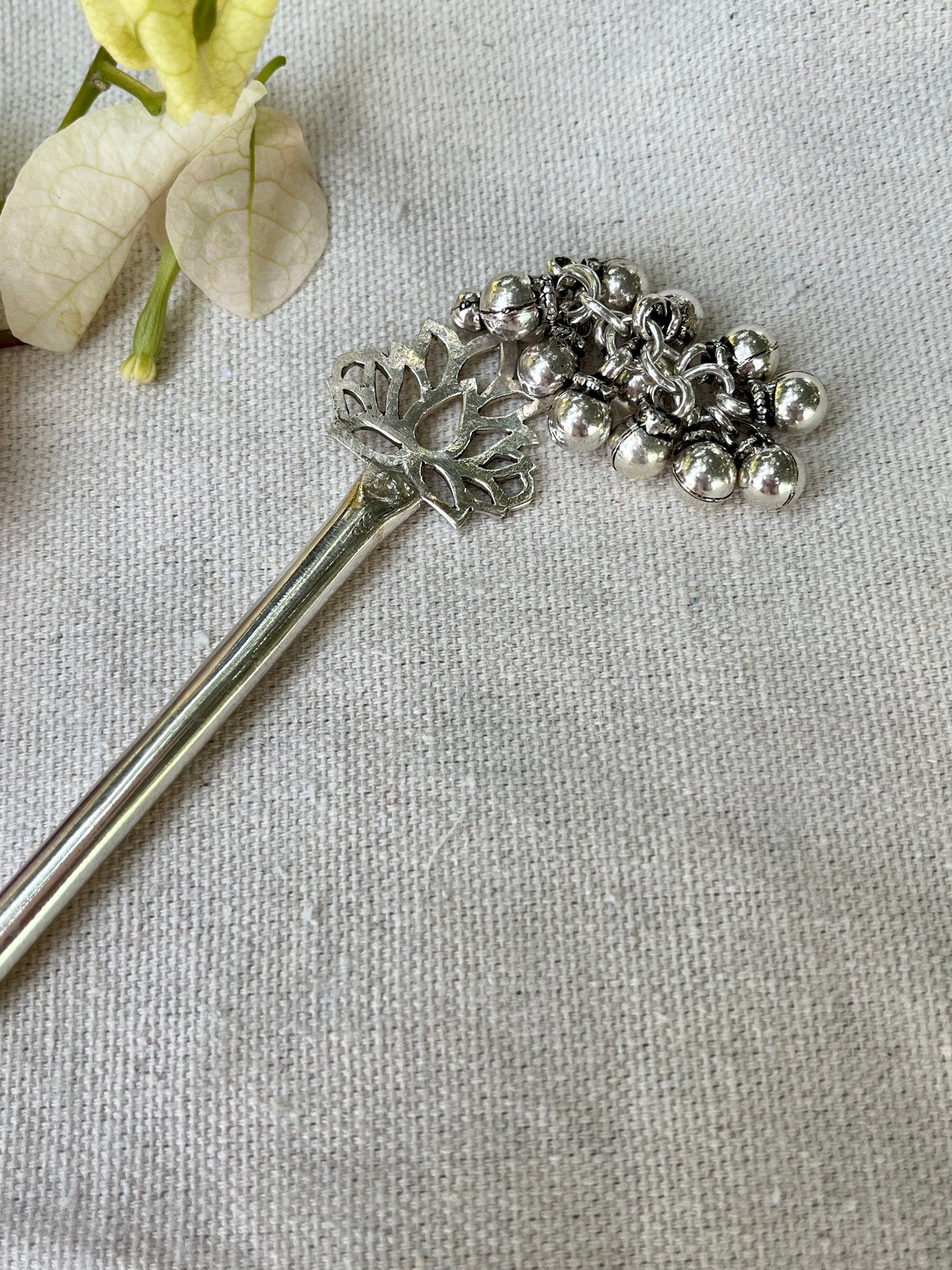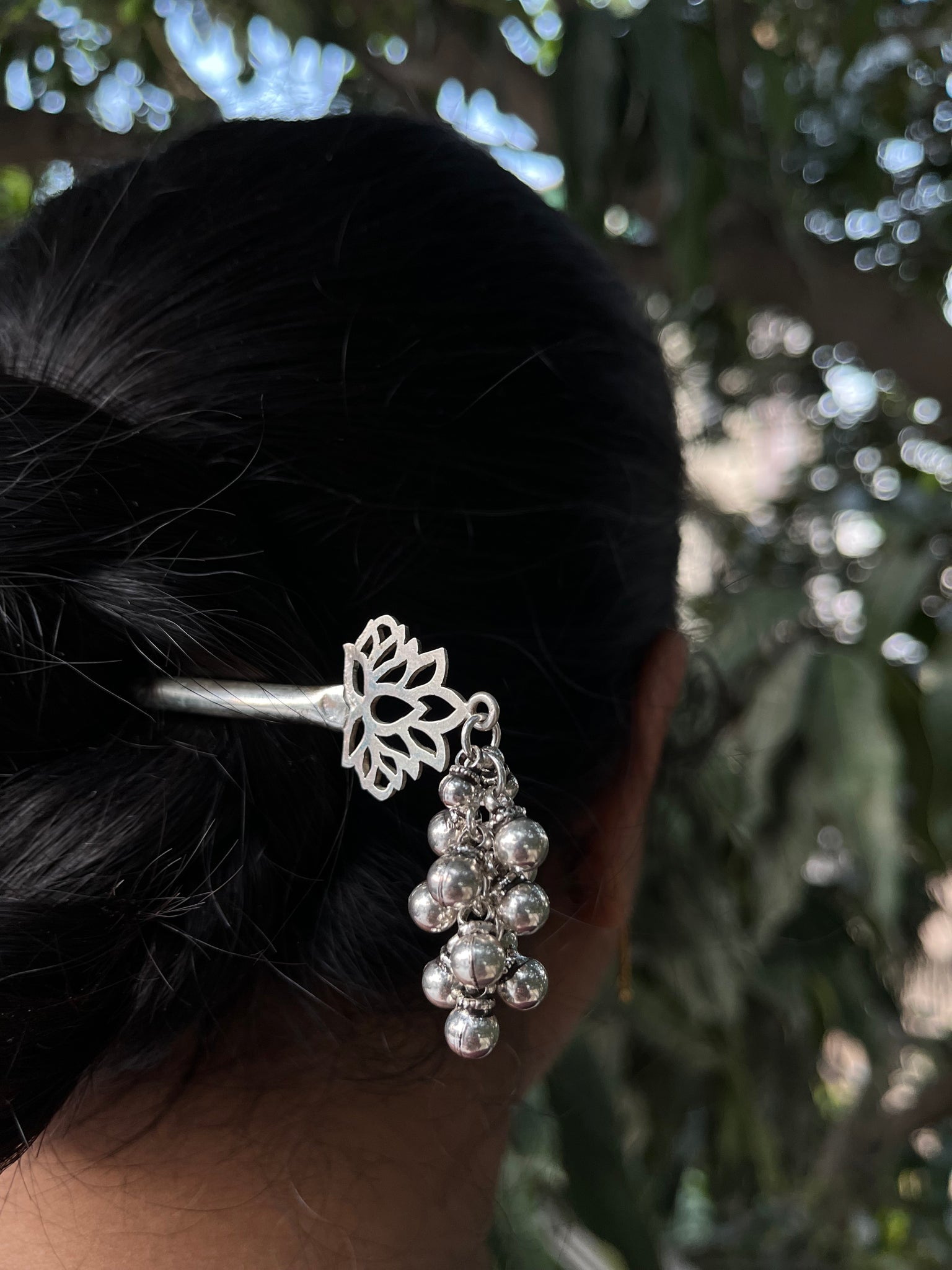 Handcrafted laser cut lotus juda stick with bunch of ghungroo hanging for medium to long hair.