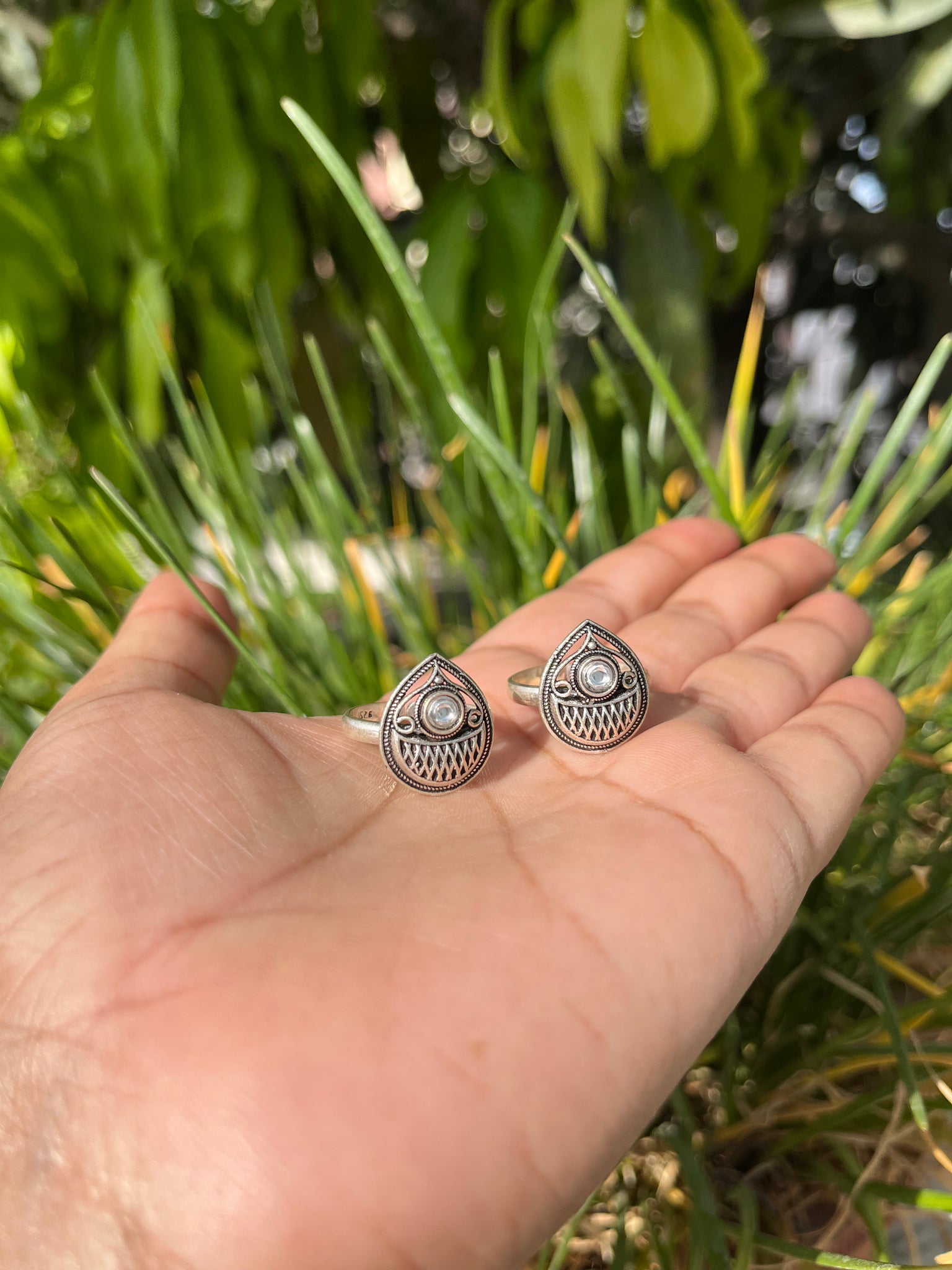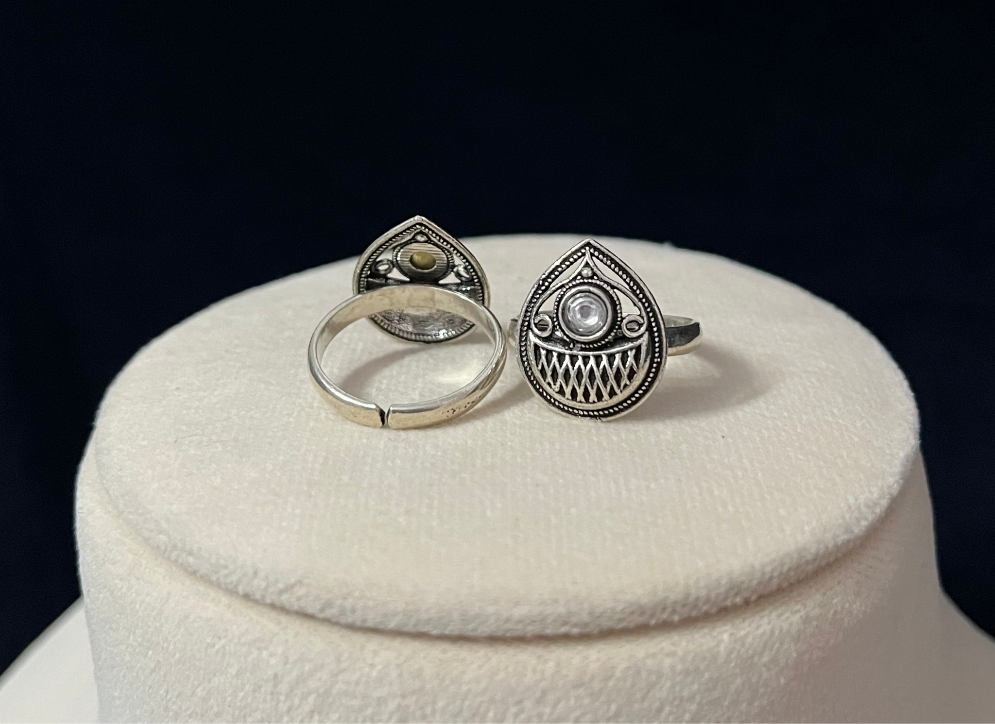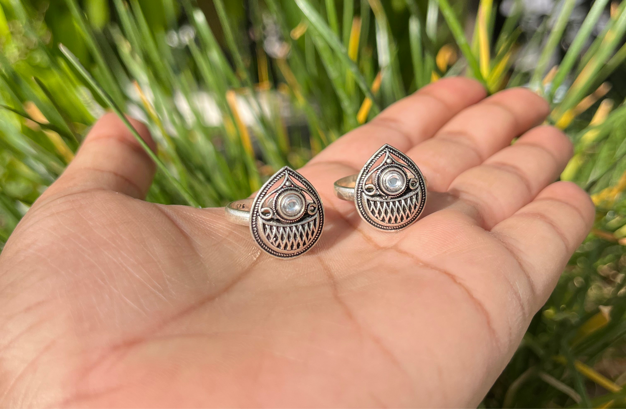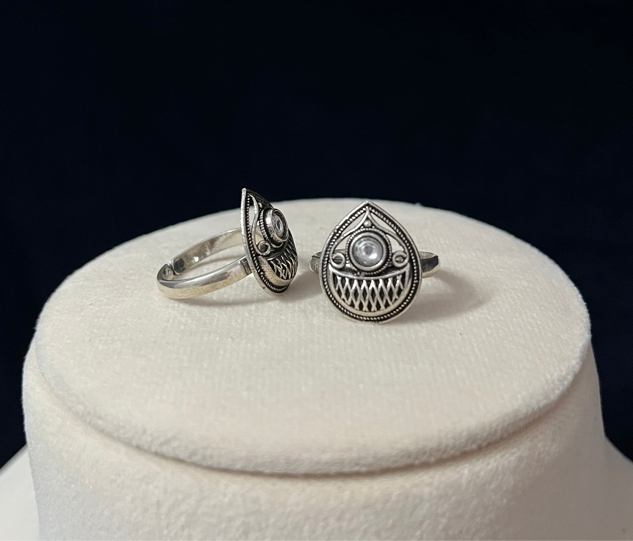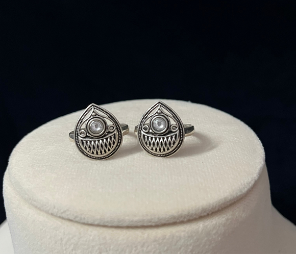 Beautifully handcrafted drop shaped carved with cubic zircon studded toe ring (Pair).