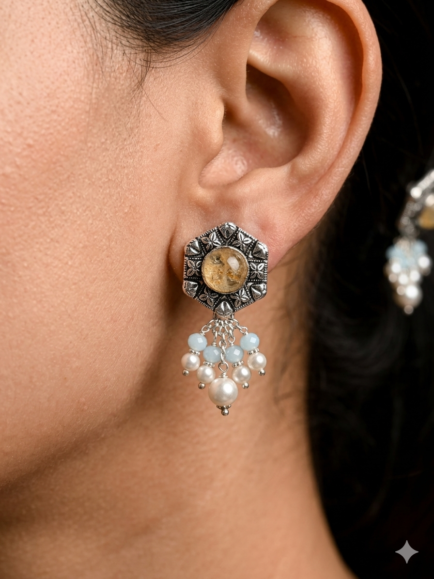 Beautiful fresh water pearl hanging moon stone studded carved flower stud earring in oxidized silver.