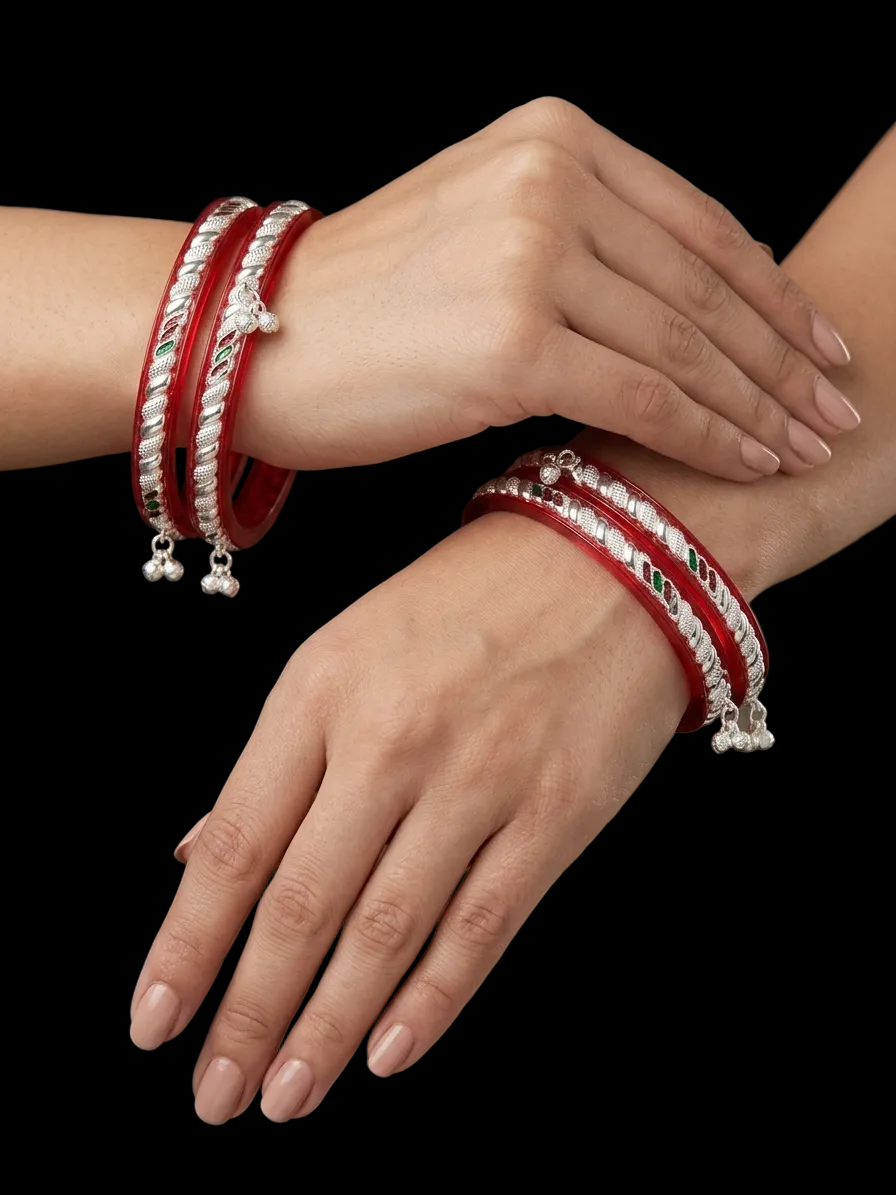 Sterling Silver bangles on red bangle base with enamel work and ghungroo hanging which enhances beauty of your wrist. Base bangle is made of plastic material.
